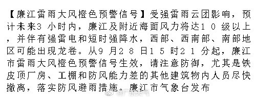 布雷雨大风橙色预警:受强雷雨云团影响廉江市形势台9月28日15时21分发,3幼时内估计将来,力将达10级以上廉江及邻近海面风,和短时强降水并伴有强雷电,部区域或者映现龙卷西部、西南部、南。