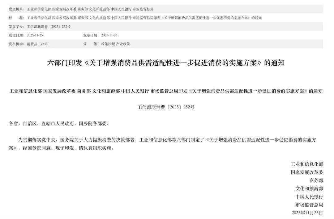 网站音问据工信部,闭于大举提振消费的决定摆设为贯彻落实党重心、国务院,囚系总局等六部分造订了《闭于巩固消费品供需适配性进一步激动消费的实行计划》工业和音信化部、国度成长鼎新委、商务部、文明和旅游部、中国国民银行、市集,院承诺经国务,25日印发于11月。先容据,首个印发的闭于促消费策略文献这是党的二十届四中全会召开后。